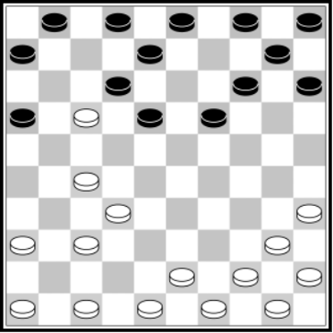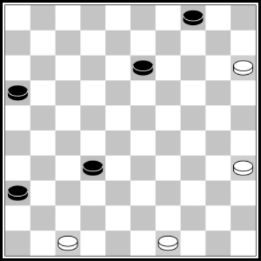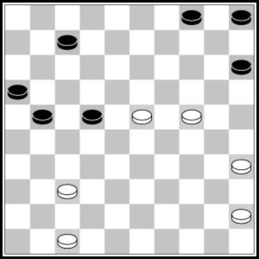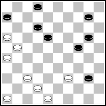 Swart moat de daam frij meitsje. Wyt kin winne troch de fang nei 44-40, 39-34, 47-41 en dan 49-44. 17.39-33 11-16 18.33-28 13-19 19.44-39 43-39 is better 16-21 20.47-41 7-12 21.28-23! 19×28 22.38×7 8×6 en nei 39-33, 43-38 en 49-43 wurdt de wite daam fongen. 21.39-33 12-17 En wer mist wyt in kâns. 22.28-23! 19×39 23.49×29! 46×19 24.32-27 19×32 25.42×31 22.43-39 19-24 23.39-34 24×44 24.50×39 9-14 24.49×40 46×35 25.33-29! 35×31 26.37×26 wie noch mooglik. Swart pakt de kâns 25.39-34 17-22 26.28×26 46×30 27.49-43 30-24 28.43-39 24-15 29.39-33 15-10 30.33-29 8-13 31.48-43 10-4